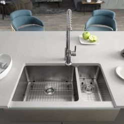 Rene 32-3/4″ Farmhouse Double Basin Stainless Steel Kitchen Sink with Basin Rack and Basket Strainer