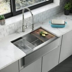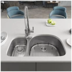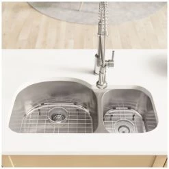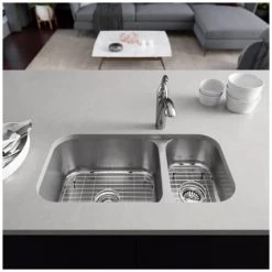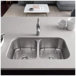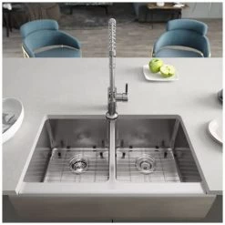 Rene 32-3/4″ Farmhouse Double Basin Stainless Steel Kitchen Sink with Basin Rack and Basket Strainer
