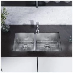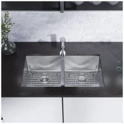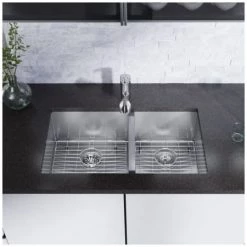 Rene 32″ Undermount Double Basin Stainless Steel Kitchen Sink with Basin Racks and Basket Strainers