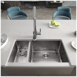Rene 32-3/4″ Farmhouse Single Basin Stainless Steel Kitchen Sink with Basin Rack and Basket Strainer