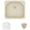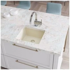 A carbon-colored, single-bowl, composite sink with a dual mount design offering the option of being installed over or below the countertop. Constructed from a unique blend of ground quartz (80%), acrylic (20%). Overall, this nearly-square sink measures 17 3/4″ x 16 7/8″ x 7 3/4″. This deep basin is inherently quiet, stain-resistant, scratch-resistant, and even heat-resistant to temperatures up to 550 degrees. It is guaranteed by a limited lifetime warranty, with template and mounting hardware included. To protect the sink surface from scratches or dents, one superior-quality, custom-fitted, stainless steel grid is included. Its removable rubber feet raise it slightly above the bottom of the sink. Included is one strainer in a matching carbon finish. It not only catches random waste, but provides the finishing touch to the sink’s appearance.