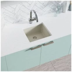 A carbon-colored, single-bowl, composite sink with a dual mount design offering the option of being installed over or below the countertop. Constructed from a unique blend of ground quartz (80%), acrylic (20%). Overall, this nearly-square sink measures 17 3/4″ x 16 7/8″ x 7 3/4″. This deep basin is inherently quiet, stain-resistant, scratch-resistant, and even heat-resistant to temperatures up to 550 degrees. It is guaranteed by a limited lifetime warranty, with template and mounting hardware included. To protect the sink surface from scratches or dents, one superior-quality, custom-fitted, stainless steel grid is included. Its removable rubber feet raise it slightly above the bottom of the sink. Included is one flange in a matching carbon finish. It fits directly over a garbage disposal, and provides the finishing touch to the sink’s appearance.