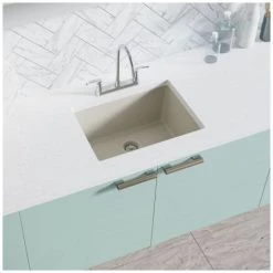 A carbon-colored, single-bowl, composite sink with a dual mount design offering the option of being installed over or below the countertop. Constructed from a unique blend of ground quartz (80%), acrylic (20%). Overall, this spacious sink measures 21 5/8″ x 16 7/8″ x 7 3/4″ and is inherently quiet, stain-resistant, scratch-resistant, and even heat-resistant to temperatures up to 550 degrees. It is guaranteed by a limited lifetime warranty, with template and mounting hardware included. To protect the sink surface from scratches or dents, one superior-quality, custom-fitted, stainless steel grid is included. Its removable rubber feet raise it slightly above the bottom of the sink. Included is one flange in a matching carbon finish. It fits directly over a garbage disposal, and provides the finishing touch to the sink’s appearance.