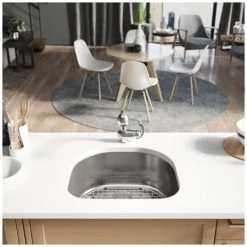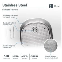 An expansive, single-bowl, undermount sink fashioned in the increasingly-popular D-shape form. Offers upscale, corner installation of the faucet and features an offset drain. Constructed from a single sheet of the highest-quality 304 steel. Overall it measures 23 1/2″ x 21″ x 9 1/4″, with a brawny 16-gauge thickness. It will not rust or stain, is insulated, quiet, and guaranteed by a limited lifetime warranty. Template, mounting hardware, and a fine-grained cutting board, custom-made to fit this basin are included. Created from the rubberwood tree, a natural hardwood, it is naturally mold and moisture resistant. Additionally, a groove along its perimeter channels away any runoff. To protect the sink surface from scratches or dents, one superior-quality, custom-fitted, stainless steel grid is included. Its removable rubber feet raise it slightly above the bottom of the sink. The included basket strainer is capable of holding much more waste than common models. Its roomy interior is perforated and can be removed with its own handle.