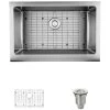 No longer constructed solely of porcelain, this apron, or farmhouse, style sink is a premier example of a modern metal, stainless steel, being used in a nostalgic design. Constructed from a single sheet of the highest-quality 304 steel. Overall it measures 23 3/4″ x 20″ x 10″, with a brawny 16-gauge thickness and a single-bowl format. It will not rust or stain, is insulated, quiet, and guaranteed by a limited lifetime warranty. Template and mounting hardware is included. The included basket strainer is capable of holding much more waste than common models. Its roomy interior is perforated and can be removed with its own handle.