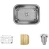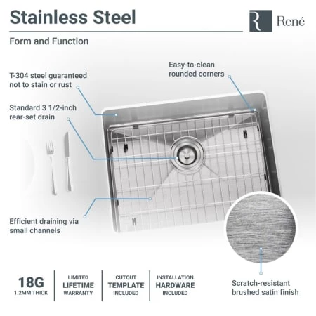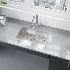 Meeting the guidelines of the Americans with Disabilities Act (ADA), this shallow sink provides more space beneath for accessibility needs. Constructed from a sheet of high-quality 304 steel. It measures 23″ x 17-7/8″ x 5-1/2″ with an 18-gauge thickness. Featuring a brushed satin finish, it is rust and stain-resistant, insulated, quiet, and guaranteed by a limited lifetime warranty. Template and mounting hardware are included. Included is a cutting board, custom-made to fit this basin. Created from the rubberwood tree, a natural hardwood, it is mold and moisture resistant. Additionally, a groove along its perimeter channels away any runoff. To protect the sink surface from scratches or dents, one custom-fit stainless steel grid is included. Its removable rubber feet raise it slightly above the bottom of the sink. The included basket strainer is capable of holding much more waste than common models. Its roomy interior is perforated and can be removed by the handle.