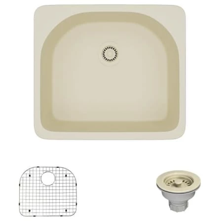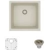 A carbon-colored, D-shape, composite sink designed to be mounted over the countertop. This sink has a wide-rimmed perimeter, with a scored faucet or accessory hole in each back corner. Constructed from a unique blend of ground quartz (80%), acrylic (20%). Overall, this spacious sink measures 25″ x 22″ x 8 1/4″ and is inherently quiet, stain-resistant, scratch-resistant, and even heat-resistant to temperatures up to 550 degrees. It is guaranteed by a limited lifetime warranty, with template and mounting hardware included. To protect the sink surface from scratches or dents, one superior-quality, custom-fitted, stainless steel grid is included. Its removable rubber feet raise it slightly above the bottom of the sink. Included is one strainer in a matching carbon finish. It not only catches random waste, but provides the finishing touch to the sink’s appearance.
