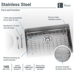 Constructed from a single sheet of the highest-quality, 304 steel; in an industrial, 14-gauge thickness. This is a rectangular, single-bowl design with 3/4″ radius corners for maximum space and easy maintenance; and an ample, 9″ depth. It mounts below the countertop. Overall its measurements are 26″ x 18″ x 9″. It is insulated, quiet, and guaranteed by a limited lifetime warranty. Template, mounting hardware, and a fine-grained cutting board, custom-made to fit this basin are included. Created from the rubberwood tree, a natural hardwood, it is naturally mold and moisture resistant. Additionally, a groove along its perimeter channels away any runoff. To protect the sink surface from scratches or dents, one superior-quality, custom-fitted, stainless steel grid is included. Its removable rubber feet raise it slightly above the bottom of the sink. The included basket strainer is capable of holding much more waste than common models. Its roomy interior is perforated and can be removed with its own handle.