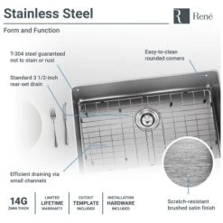 Single bowl sink constructed from a single sheet of the highest-quality 304 steel. As a member of the 3/4″ radius line of sinks, it provides maximum space and easy maintenance. It features an industrial 14-gauge thickness and is designed to be mounted under the countertop. Overall it measures 28 1/8″ x 17 7/8″ x 9 3/8″. It is insulated, quiet, and guaranteed by a limited lifetime warranty. Template, mounting hardware, and a fine-grained cutting board, custom-made to fit this basin are included. Created from the rubberwood tree, a natural hardwood, it is naturally mold and moisture resistant. Additionally, a groove along its perimeter channels away any runoff. To protect the sink surface from scratches or dents, one superior-quality, custom-fitted, stainless steel grid is included. Its removable rubber feet raise it slightly above the bottom of the sink. The included basket strainer is capable of holding much more waste than common models. Its roomy interior is perforated and can be removed with its own handle.