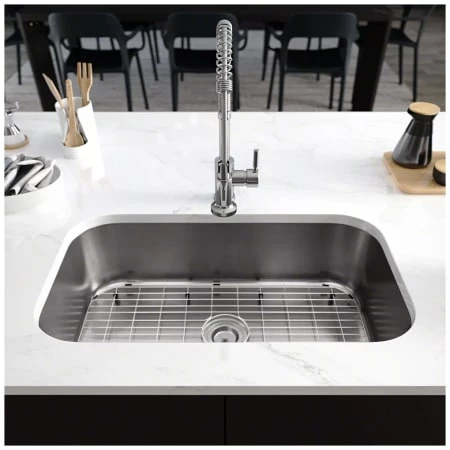 - Includes basket strainer, stainless steel grid, and fitted cutting board