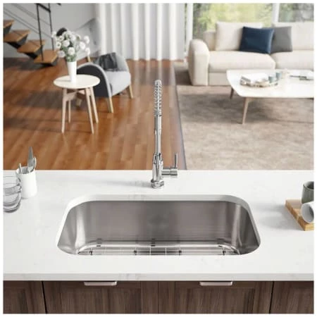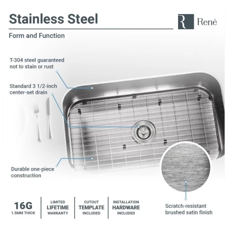 An expansive, single-bowl, undermount sink with broad, sweeping corners and a centerset drain. Constructed from a single sheet of the highest-quality 304 steel. Overall it measures 31 1/2″ x 18 3/4″ x 10 1/8″, with a brawny 16-gauge thickness. It will not rust or stain, is insulated, quiet, and guaranteed by a limited lifetime warranty. Template, mounting hardware, and a fine-grained cutting board, custom-made to fit this basin are included. Created from the rubberwood tree, a natural hardwood, it is naturally mold and moisture resistant. Additionally, a groove along its perimeter channels away any runoff. To protect the sink surface from scratches or dents, one superior-quality, custom-fitted, stainless steel grid is included. Its removable rubber feet raise it slightly above the bottom of the sink. The included basket strainer is capable of holding much more waste than common models. Its roomy interior is perforated and can be removed with its own handle.
