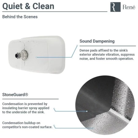 - Sound dampening pads diminish noise and sprayed-on coating creates a moisture barrier