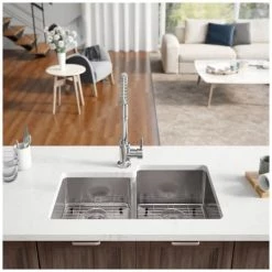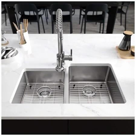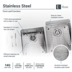 An undermount sink, divided into one large basin on the right and a smaller, but still considerable, prep sink, front-aligned on the left. Each bowl has tight, 3/4-inch diameter corners and an offset drain. Constructed from a single sheet of the highest-quality 304 steel. Overall it measures 31 1/4″ x 20 1/2″ x 9″, with a heavy-duty, 14-gauge thickness. It will not rust or stain, is insulated, quiet, and guaranteed by a limited lifetime warranty. Template, mounting hardware, and a fine-grained cutting board, custom-made to fit this basin are included. Created from the rubberwood tree, a natural hardwood, it is naturally mold and moisture resistant. Additionally, a groove along its perimeter channels away any runoff. To protect the sink surface from scratches or dents, two superior-quality, custom-fitted, stainless steel grids are included. The removable rubber feet raise them slightly above the bottom of the sink. One standard strainer, identified by its traditional shallow basket and stopper mechanism; and one basket strainer, with a deep, perforated, metal basket; are included.