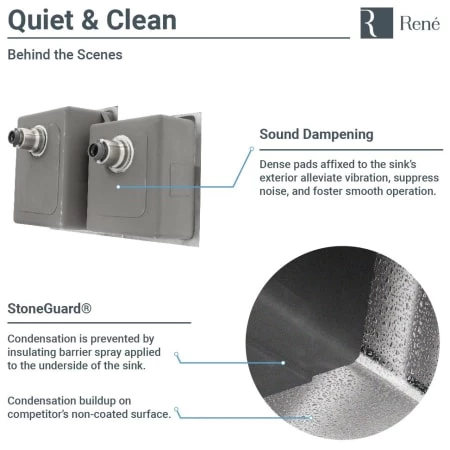 - Sound dampening pads diminish noise and sprayed-on coating creates a moisture barrier
