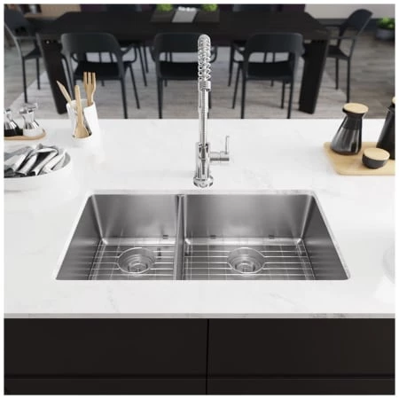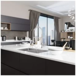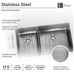 An expansive, undermount sink of stainless steel; divided into two unequal-sized basins. A thin divide separates the wide basin on the right from the narrower basin on the left. They remain equal in length front to back and each features tight, 3/4-inch diameter corners and offset drains. Constructed from a single sheet of the highest-quality 304 steel. Overall it measures 31 1/8″ x 18″ x 9 5/8″, with a heavy-duty, 14-gauge thickness. It will not rust or stain, is insulated, quiet, and guaranteed by a limited lifetime warranty. Template, mounting hardware, and a fine-grained cutting board, custom-made to fit this basin are included. Created from the rubberwood tree, a natural hardwood, it is naturally mold and moisture resistant. Additionally, a groove along its perimeter channels away any runoff. To protect the sink surface from scratches or dents, two superior-quality, custom-fitted, stainless steel grids are included. The removable rubber feet raise them slightly above the bottom of the sink. One standard strainer, identified by its traditional shallow basket and stopper mechanism; and one basket strainer, with a deep, perforated, metal basket; are included.