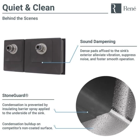 - Sound dampening pads diminish noise and sprayed-on coating creates a moisture barrier
