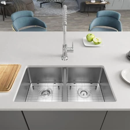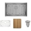 An expansive, undermount sink divided equally into two bowls; each with tight, 3/4″ diameter corners and an offset drain. Constructed from a single sheet of the highest-quality 304 steel. Overall it measures 31″ x 18-1/8″ x 9″, with a heavy-duty, 18-gauge thickness. In addition to its stain and rust resistance, this sink is fully insulated, ensuring a quiet and functioning basin covered under a limited lifetime warranty. Template and mounting hardware is included. Included is a fine-grained cutting board, custom-made to fit this basin. Created from the rubberwood tree, a natural hardwood, it is naturally mold and moisture resistant. Additionally, a groove along its perimeter channels away any runoff. To protect the sink surface from scratches or dents, two superior-quality, custom-fitted, stainless steel grids are included. The removable rubber feet raise them slightly above the bottom of the sink. One standard strainer, identified by its traditional shallow basket and stopper mechanism; and one basket strainer, with a deep, perforated, metal basket; are included.