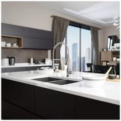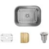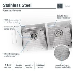 An expansive, undermount sink divided equally into two bowls; each with tight, 3/4-inch diameter corners and an offset drain. Constructed from a single sheet of the highest-quality 304 steel. Overall it measures 31″ x 18″ x 9″, with a heavy-duty, 14-gauge thickness. It will not rust or stain, is insulated, quiet, and guaranteed by a limited lifetime warranty. Template, mounting hardware, and a fine-grained cutting board, custom-made to fit this basin are included. Created from the rubberwood tree, a natural hardwood, it is naturally mold and moisture resistant. Additionally, a groove along its perimeter channels away any runoff. To protect the sink surface from scratches or dents, two superior-quality, custom-fitted, stainless steel grids are included. The removable rubber feet raise them slightly above the bottom of the sink. One standard strainer, identified by its traditional shallow basket and stopper mechanism; and one basket strainer, with a deep, perforated, metal basket; are included.