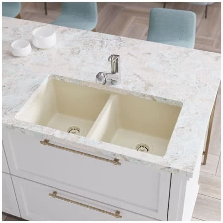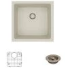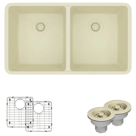 A carbon-colored, composite sink, split evenly into two basins. Constructed from a unique blend of ground quartz (80%), acrylic (20%). Overall, this undermount sink measures 32 1/2″ x 18 5/8″ x 9 1/2″. Its deep basins are inherently quiet, stain-resistant, scratch-resistant, and even heat-resistant to temperatures up to 550 degrees. It is guaranteed by a limited lifetime warranty, with template and mounting hardware included. To protect the sink surface from scratches or dents, two superior-quality, custom-fitted, stainless steel grids are included. The removable rubber feet raise them slightly above the bottom of the sink. Included are two strainers in a matching carbon finish. They not only catch random waste, but provide the finishing touch to the sink’s appearance.