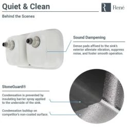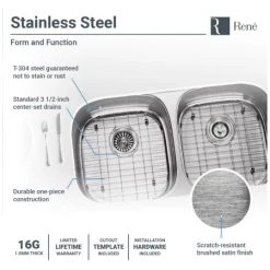 A moderate-sized, undermount sink divided equally into two bowls; each with broadly-curved corners and offset drains. Constructed from a single sheet of the highest-quality 304 steel. Overall it measures 32 1/2″ x 18 1/4″ x 8 1/4″, with a brawny 16-gauge thickness. It will not rust or stain, is insulated, quiet, and guaranteed by a limited lifetime warranty. Template, mounting hardware, and a fine-grained cutting board, custom-made to fit this basin are included. Created from the rubberwood tree, a natural hardwood, it is naturally mold and moisture resistant. Additionally, a groove along its perimeter channels away any runoff. To protect the sink surface from scratches or dents, two superior-quality, custom-fitted, stainless steel grids are included. The removable rubber feet raise them slightly above the bottom of the sink. One standard strainer, identified by its traditional shallow basket and stopper mechanism; and one basket strainer, with a deep, perforated, metal basket; are included.