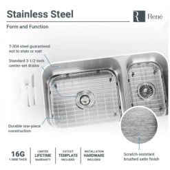 An undermount sink divided unequally into a large bowl on the left and shallower prep bowl on the right; each with broadly-curved corners and centerset drains. Constructed from a single sheet of the highest-quality 304 steel. Overall it measures 32 1/4″ x 18″ x 9 1/4″, with a heavy-duty, 16-gauge thickness. It will not rust or stain, is insulated, quiet, and guaranteed by a limited lifetime warranty. Template, mounting hardware, and a fine-grained cutting board, custom-made to fit this basin are included. Created from the rubberwood tree, a natural hardwood, it is naturally mold and moisture resistant. Additionally, a groove along its perimeter channels away any runoff. To protect the sink surface from scratches or dents, two superior-quality, custom-fitted, stainless steel grids are included. The removable rubber feet raise them slightly above the bottom of the sink. One standard strainer, identified by its traditional shallow basket and stopper mechanism; and one basket strainer, with a deep, perforated, metal basket; are included.