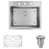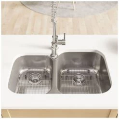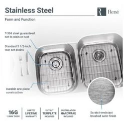 Two different-sized bowls, the large one on the right deeper than the small one on the left; are ready for undermount installation. The forward alignment of both bowls allows for a faucet to be installed where the bowls meet. Constructed from a single sheet of the highest-quality 304 steel. Overall it measures 32″ x 20 3/4″ x 9 1/4″, with a brawny 16-gauge thickness. It will not rust or stain, is insulated, quiet, and guaranteed by a limited lifetime warranty. Template, mounting hardware, and a fine-grained cutting board, custom-made to fit this basin are included. Created from the rubberwood tree, a natural hardwood, it is naturally mold and moisture resistant. Additionally, a groove along its perimeter channels away any runoff. To protect the sink surface from scratches or dents, two superior-quality, custom-fitted, stainless steel grids are included. The removable rubber feet raise them slightly above the bottom of the sink. One standard strainer, identified by its traditional shallow basket and stopper mechanism; and one basket strainer, with a deep, perforated, metal basket; are included.