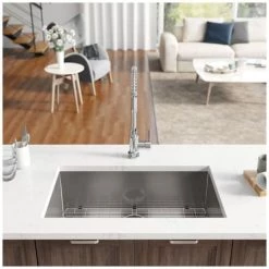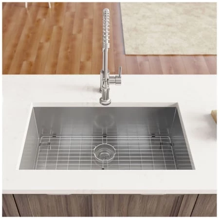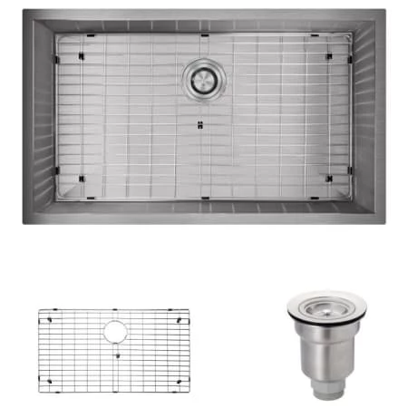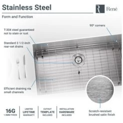 A single-bowl, undermount sink with tight, 90-degree corners and an offset drain. Perfect when a wide deep basin is required. Constructed from a single sheet of the highest-quality 304 steel. Overall it measures 32″ x 19″ x 10″, with a brawny 16-gauge thickness. It will not rust or stain, is insulated, quiet, and guaranteed by a limited lifetime warranty. Template and mounting hardware is included. To protect the sink surface from scratches or dents, one superior-quality, custom-fitted, stainless steel grid is included. Its removable rubber feet raise it slightly above the bottom of the sink. The included basket strainer is capable of holding much more waste than common models. Its roomy interior is perforated and can be removed with its own handle.