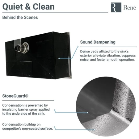 - Sound dampening pads diminish noise and sprayed-on coating creates a moisture barrier
