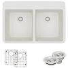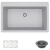 A carbon-colored, composite sink, split evenly into two basins; but with one shorter to allow contemporary placement of the faucet along the back where they meet. This top mount sink has a wide-rimmed perimeter, and a ledge along the back with scored faucet and accessory holes. Constructed from a unique blend of ground quartz (80%), acrylic (20%). Overall it measures 33″ x 22″ x 9 1/2″. Its deep basins are inherently quiet, stain-resistant, scratch-resistant, and even heat-resistant to temperatures up to 550 degrees. It is guaranteed by a limited lifetime warranty, with template and mounting hardware included. To protect the sink surface from scratches or dents, two superior-quality, custom-fitted, stainless steel grids are included. The removable rubber feet raise them slightly above the bottom of the sink. Included are two strainers in a matching carbon finish. They not only catch random waste, but provide the finishing touch to the sink’s appearance.