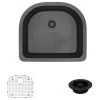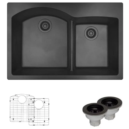 A composite sink with two offset basins each with slightly bowed backsides and a low divide between them. It has a wide-rimmed perimeter, and a ledge along the back with scored faucet and accessory holes. Constructed from a unique blend of ground quartz (80%), acrylic (20%). Overall, this top mount sink measures 33″ x 22″ x 10-1/2″. Its deep basins are inherently quiet, stain-resistant, scratch-resistant, and even heat-resistant to temperatures up to 550 degrees. It is guaranteed by a limited lifetime warranty, with template and mounting hardware included. To protect the sink surface from scratches or dents, two superior-quality, custom-fitted, stainless steel grids are included. The removable rubber feet raise them slightly above the bottom of the sink. Included are two strainers in a matching finish. They not only catch random waste but provide the finishing touch to the sink’s appearance.