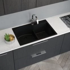 - Sink features dual basins with a 60/40 split