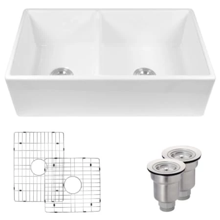 This breathtaking glazed fireclay sink is made to be durable and elegant for generations to come. Fireclay is fired at over 2,000 degrees Fahrenheit, creating a product that will not chip or scratch, and is stain and heat resistant. With overall measurements of 33″ x 18″ x 10″, this double offset bowl sink provides an ample amount of workspace. This timeless, ceramic apron front will not disappoint on beauty, nor on function, as it is built to last a lifetime. For added elegance and character, this sink is reversible and can have a smooth traditional front or a stylish fluted front. To protect the sink surface from scratches or dents, two superior-quality, custom-fitted stainless steel grids are included. Their removable rubber feet raise them slightly above the bottom of the sink. The included basket strainers are capable of holding much more waste than common models. Their roomy interiors are perforated and can be removed by the handle.