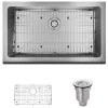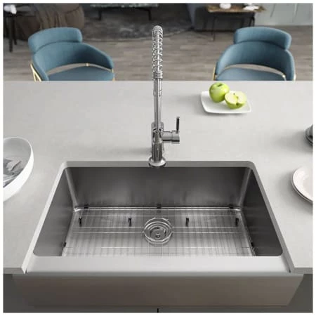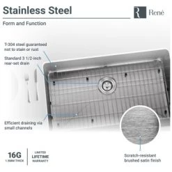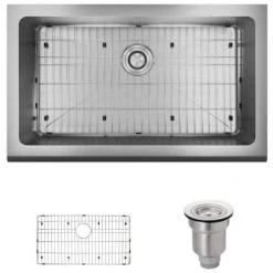No longer constructed solely of porcelain, this apron, or farmhouse, style sink is a premier example of a modern metal, stainless steel, being used in a nostalgic design. Constructed from a single sheet of the highest-quality 304 steel. Overall it measures 32 3/4″ x 20″ x 10″, with a brawny 16-gauge thickness and a single-bowl format. It will not rust or stain, is insulated, quiet, and guaranteed by a limited lifetime warranty. Template and mounting hardware is included. To protect the sink surface from scratches or dents, one superior-quality, custom-fitted, stainless steel grid is included. Its removable rubber feet raise it slightly above the bottom of the sink. The included basket strainer is capable of holding much more waste than common models. Its roomy interior is perforated and can be removed with its own handle.