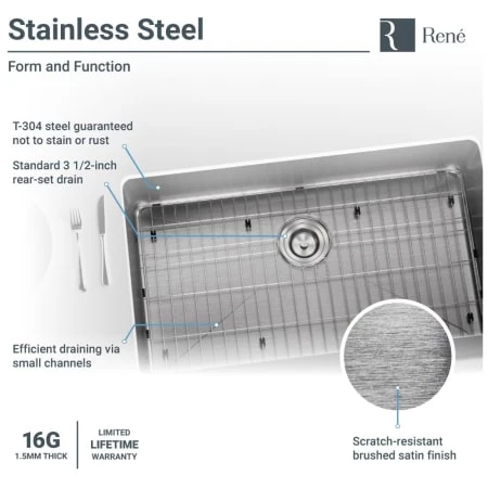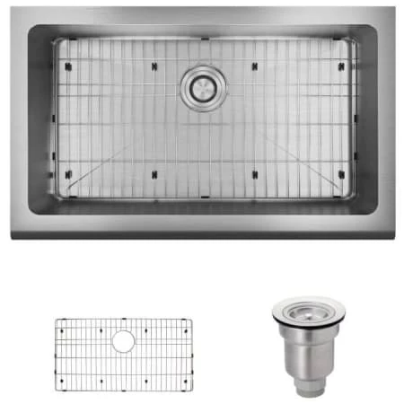 - Includes basket strainer, stainless steel grid, and fitted cutting board