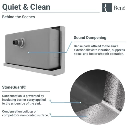 - Sound dampening pads diminish noise and sprayed-on coating creates a moisture barrier