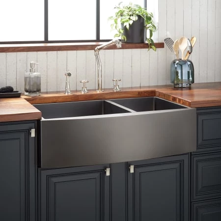 Complete your kitchen remodel with the 36″ Atlas double-bowl farmhouse sink. With a split basin so that one bowl is larger than the other, this product is perfect for organization. A gently curved front apron flawlessly complements its dusky gunmetal black finish. To protect its surface, this item goes through a specialized treatment process which leaves it water repellant and shielded from scratching. Type 304 stainless steel with a 16-gauge finish ensures everlasting performance. Enhancing its premium construction, sound-absorbing pads and a thin layer of foam insulation are applied to the outer walls to prevent condensation buildup. Match an optional set of drains with your choice of faucet to complete the look.