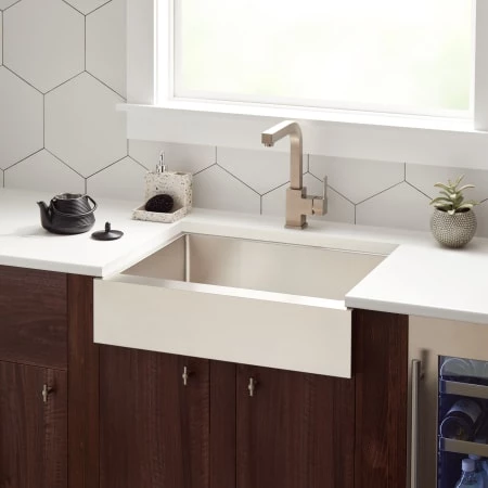 The 27″ Hazelton Stainless Steel Retrofit Farmhouse Sink fits into your kitchen without needing to modify existing cabinetry. The short apron sits above your doors, so functionality is never compromised. This sink has a single well that is designed to handle the demands of a busy home.
