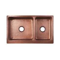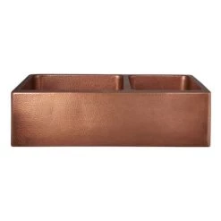 Copper construction and a hammered, textured front make the Tegan Farmhouse Sink the perfect choice for a rustic or Old World-style kitchen. Its two deep interior wells are offset, allowing more room to wash and rinse large pots and pans, or accomplish food prep chores.